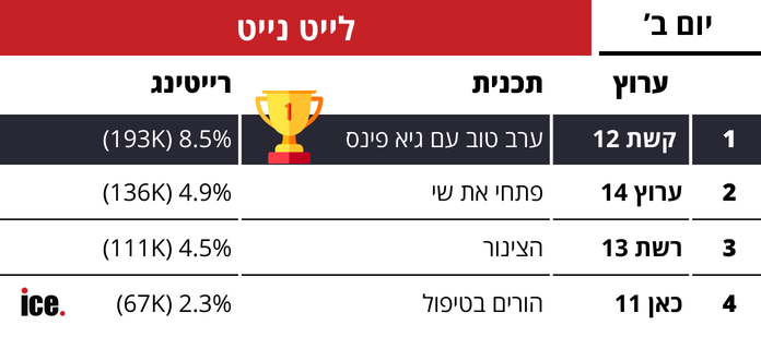 בגזרת הלייט נייט, שוב הפתעה. "ערב טוב עם גיא פינס" אמנם מנצח ובגדול עם 8.5% רייטינג ו-136 אלף צופים אבל ההפתעה מגיעה מהמקום השני. "פתחי את שי" מנצח בענק את גיא לרר ו-"הצינור" עם 4.9% רייטינג ו-136 אלף צופים ואילו התכנית ברשת 13 השיגה רק 4.5% רייטינג ו-111 אלף צופים. כאן 11 עם "הורים בטיפול" עם 2.3% רייטינג ו-67 אלף צופים.
