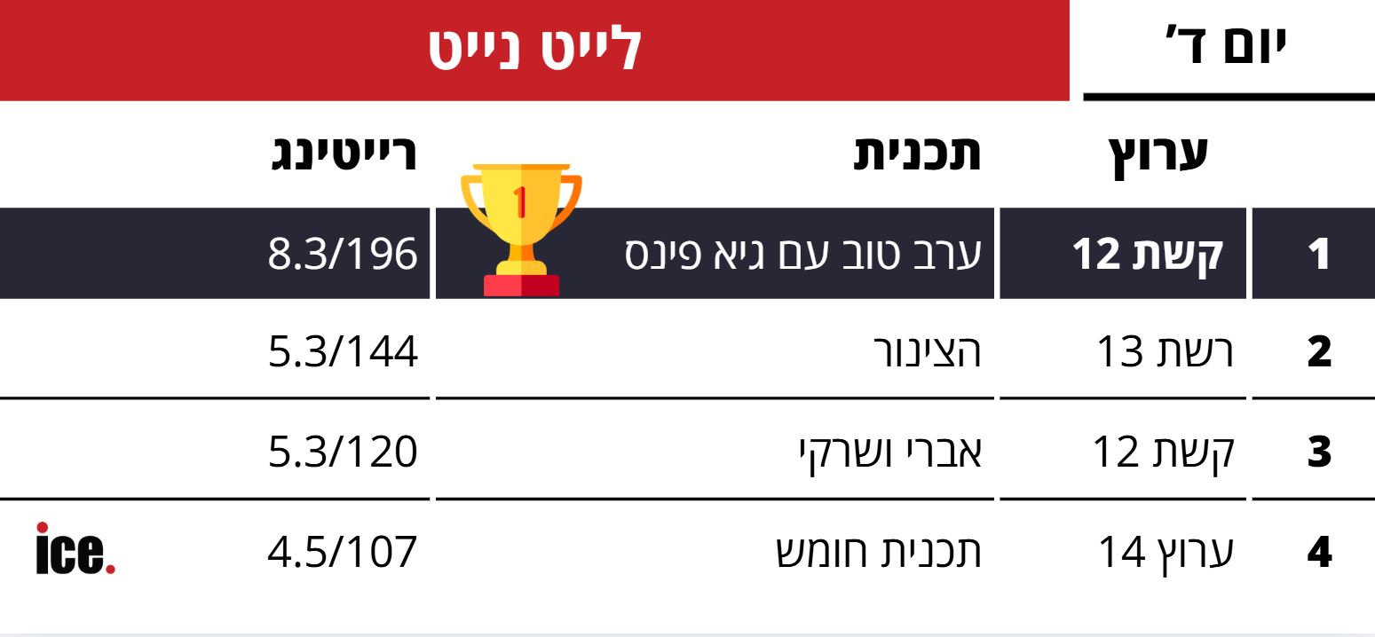 במסגרת תכניות הלייט נייט: במקום הראשון גיא פינס של קשת 12 עם 8.3% רייטינג שהם כ-196 אלף צופים. במקום השני הצינור של רשת 13 שרושמים 5.3% רייטינג שהם כ-144 אלף צופים. במקום השלישי אברי ושרקי של קשת 12 עם 5.3% רייטינג שהם כ-120 אלף צופים.