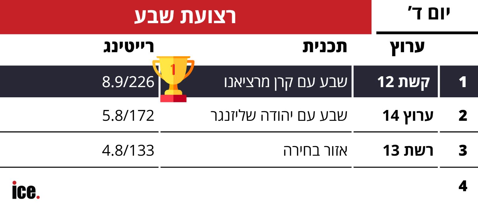 במסגרת הרצועה של שבע: במקום הראשון שבע עם קרן מרציאנו שרושמת 8.9% רייטינג שהם כ-226 אלף צופים. במקום השני שבע עם שלזינגר של ערוץ 14 שרושמים 5.8% רייטינג שהם כ-173 אלף צופים. במקום השלישי אזור בכירה של רשת 13 שרושמים 4.8% רייטינג שהם כ-133 אלף צופים.