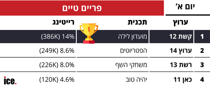 בפריים טיים, קשת 12 מובילה בפער עם "מועדון לילה" שרשמה נתון של 14% רייטינג ו-386 אלף צפיות, ערוץ 14 עוקף את רשת 13 פעם נוספת עם "הפטריוטים", שזכתה ל-8.6% רייטינג (249 אלף צופים). רשת 13 עם "משחקי השף" זכו ל-8% (226 אלף צופים) הגיעו למקום השלישי, ולמקום הרביעי סוגרת את הרשימה התכנית "יהיה טוב" של כאן 11, שרשמה נתון של 4.6% רייטינג ו-120 אלף צופים.