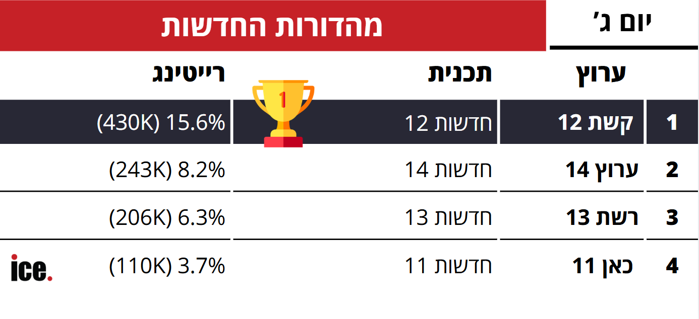 המהדורה שמובילה את דירוג רייטינג היומי של ice ללא תחרות היא המהדורה המרכזית של קשת 12 שמנצחת בענק עם 15.6% רייטינג ו-430 אלף צופים. המהדורה בערוץ 14 עם 8.2% רייטינג ו-241 אלף צופים, מייד אחריה, חדשות 13 עם 6.3% רייטינג ו-205 אלף צופים וסוגרת את הרשימה היא כאן 11 עם 3.7% רייטינג ו-110 אלף צופים.