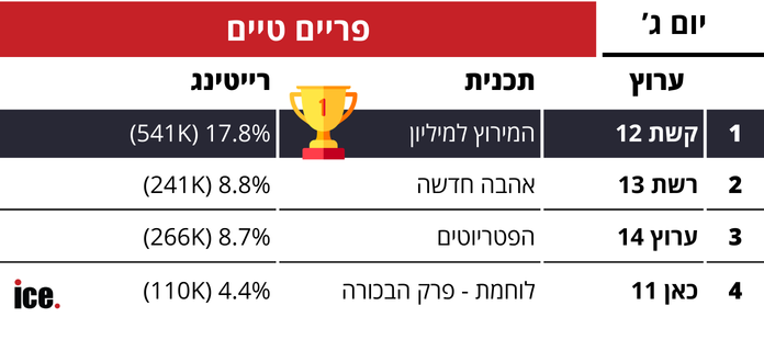 דירוג הרייטינג היומי של ice: "המירוץ למיליון" עם 17.8% ו-540 אלף צופים, קרב על המקום השני בין "אהבה חדשה" ו-"הפטריוטים", מי המנצחת הגדולה של הערב?