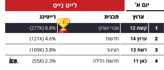 במסגרת רצועת הלייט נייט: במקום הראשון אברי ושרקי של קשת 12 שרשמו 8.8% רייטינג שהם כ-277 אלף צופים. במקום השני חדשות של ערוץ 14 עם 4.6% רייטינג שהם כ-121 אלף צופים. במקום השלישי הצינור של רשת 13 עם 3.8% רייטינג שהם כ-109 אלף צופים. במקום הרביעי חדשות הלילה של כאן 11 עם 2.3% רייטינג שהם כ-55 אלף צופים.