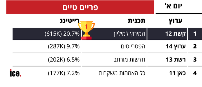 רייטינג: ערוץ 12 שולט בטבלאות, "המירוץ למיליון" כובשת את המקום הראשון בפער ענק עם 20% רייטינג. הפטריוטים מיד אחריהם, רשת 13 וכאן 11 בקרב צמוד