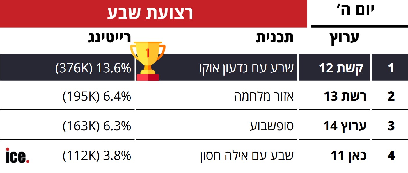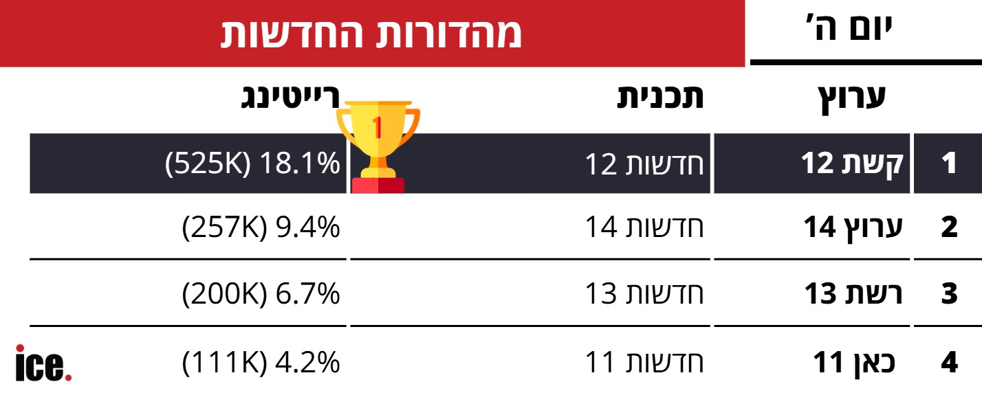 חדשות 12 מתחזקת מהנתון בשבוע שעבר, וחדשות 14 נחלשת. "מה שתגידו" ב"כאן 11" עקפה את "כלוב הזהב" ו"רשת 13"