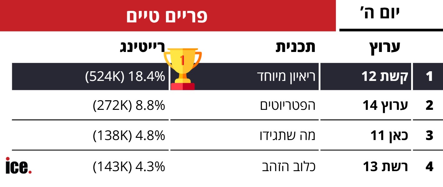 בפריים טיים, "ריאיון מיוחד" בהנחיית רותם סלע ובהשתתפות ציפי שביט גרף 18.4% רייטינג (524 אלף צופים) - וסיים את היום כמנצח הגדול עם שיא חדש. במקום השני, "הפטריוטים" של ערוץ 14 עם 8.8% רייטינג (272 אלף צופים). "מה שתגידו" של כאן 11 סיימה במקום השלישי עם 4.8% רייטינג (138 אלף צופים). במקום האחרון, רשת 13 עם "כלוב הזהב" שקיבל 4.3% רייטינג (143 אלף צופים).
