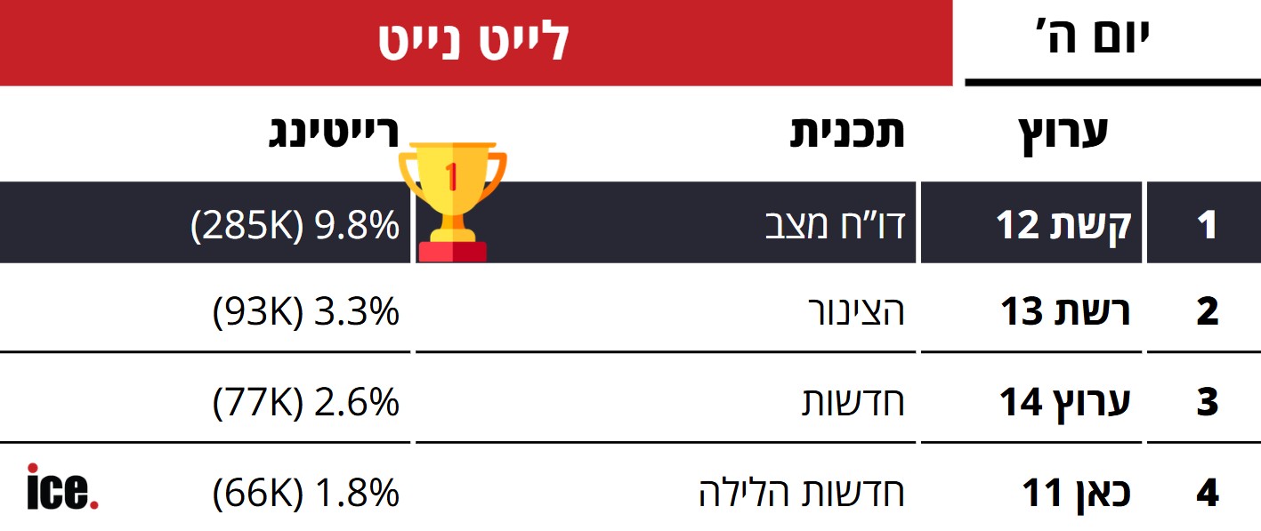 אתמול (חמישי), חדשות 12 סיכמה את השידור עם נתון פנטסטי וזכתה ל-18.1% רייטינג (525 אלף צופים) - מעל ההישג בשבוע שעבר באותה המשבצת. חדשות 14 מידרדרת אך שומרת על המקום השני עם שידור המהדורה המרכזית שזכה ל-9.4% רייטינג (257 אלף צופים).