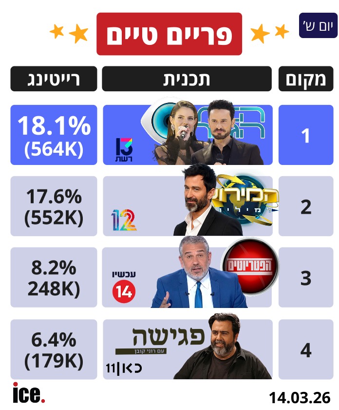 רייטינג: "האח הגדול" בניצחון שלישי ברצף - ומהפכה בלייט נייט