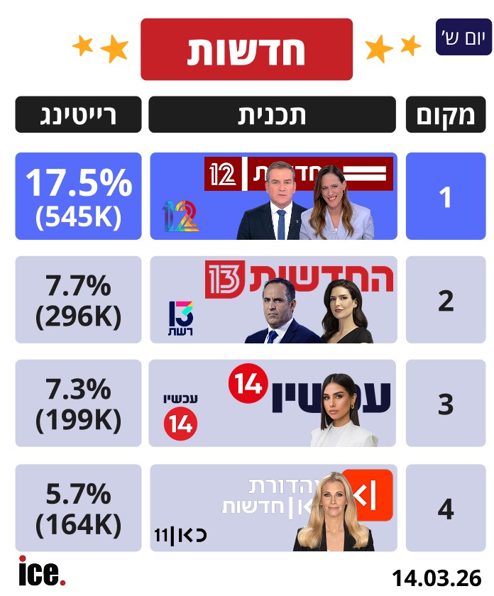 אתמול (שבת), מהדורת החדשות הנצפית בישראל הייתה חדשות 12, שזכתה ל-17.5% רייטינג (545 אלף צופים). חדשות 13 מצליחה ליהנות מהתנופה המחודשת עם כניסתם של משקיעי ההייטק וקרן מריט, ומשתבצת במקום השני עם 7.7% רייטינג (296 אלף צופים).
