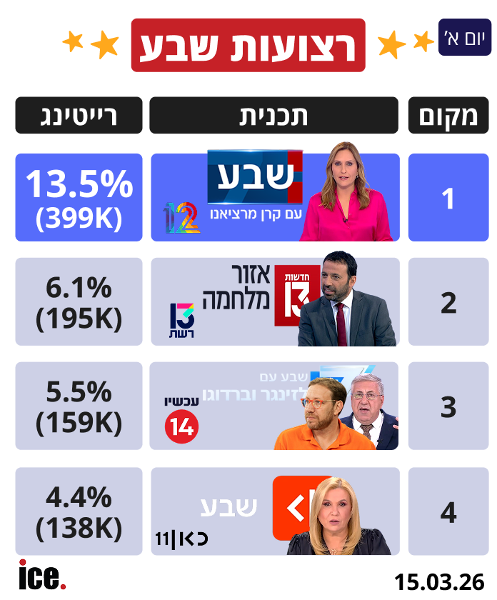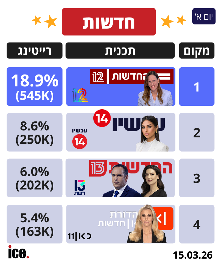 קרדיט: מסך קשת 12, מסך רשת 13, מסך ערוץ 14, מסך כאן 11