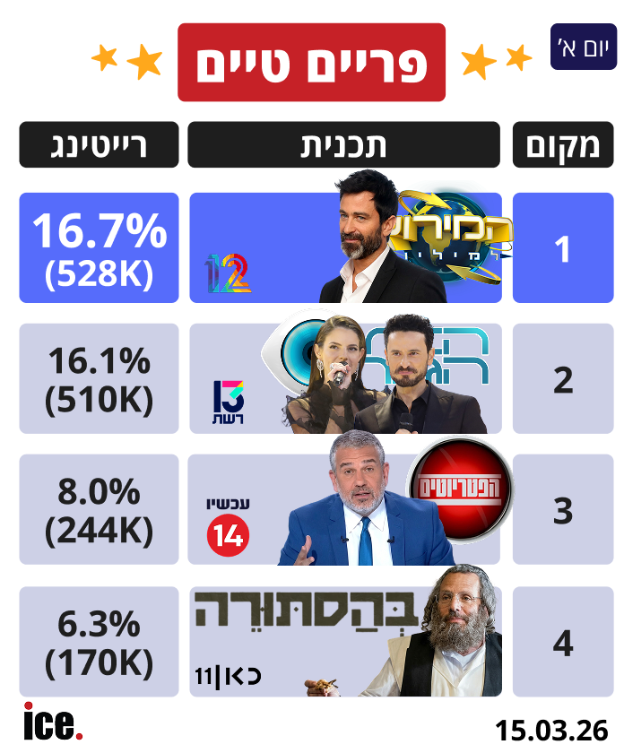 בגזרת הפריים טיים, "המירוץ למיליון" במקום הראשון על חשבונה של המתחרה העיקרית, "האח הגדול". התכנית האהובה בקשת 12 גרפה 16.7% רייטינג ו-528 אלף צופים ומנגד, התכנית של רשת 13 רשמה נתון של 16.1% רייטינג ו-510 אלף צופים.