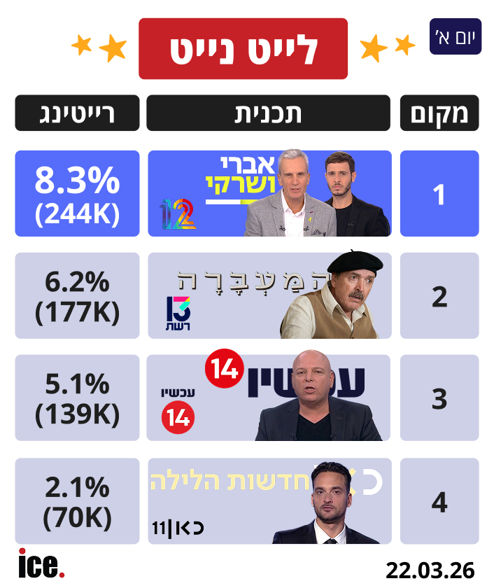במסגרת רצועת הלייט נייט אברי ושרקי של קשת 12 רושמים 8.3% רייטינג שהם כ-244 אלף צופים. במקום השני המעברה של רשת 13 שרושמים 6.2% ריייטינג שהם כ-177 אלף צופים. במקום השלישי עכשיו של ערוץ 14 שרושמים 5.1% רייטינג שהם כ-139 אלף צופים. במקום הרביעי חדשות הלילה של כאן 11 שרושמים 2.1% רייטינג שהם כ-70 אלף צופים.