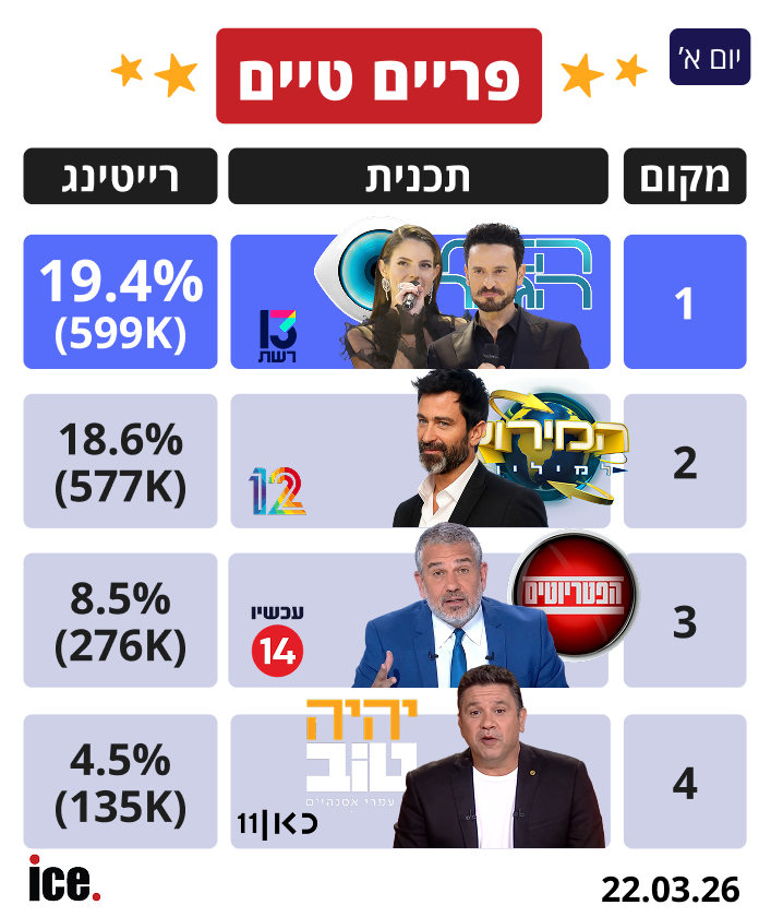 רייטינג יומי: האח הגדול והמירוץ למיליון בקרב ענקיות, חדשות 14 מרסקים את של 13, וקרן מרציאנו עם ידה על העליונה | הסיכום המלא