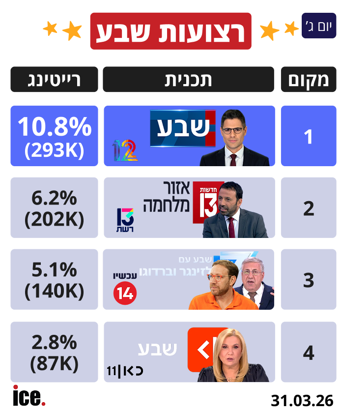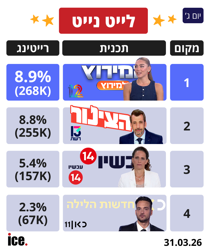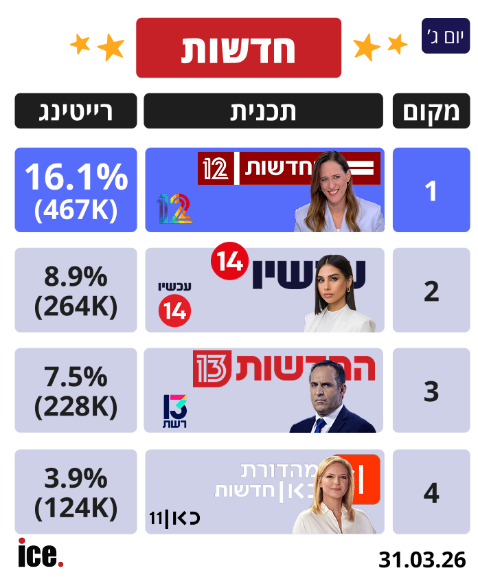 אתמול (שלישי), מהדורת החדשות הנצפית ביותר בישראל הייתה "חדשות 12" שזכתה ל-16.1% רייטינג (466 אלף צופים), בעוד שבמקום השני "חדשות 14" עם 8.9% רייטינג (265 אלף צופים) - שעוקפת את "חדשות 13" שהפתיעה אותה בטבלה שלשום. חדשות 13 כאמור נועצת את השלישייה הראשונה עם 7.5% רייטינג (228 אלף צופים).