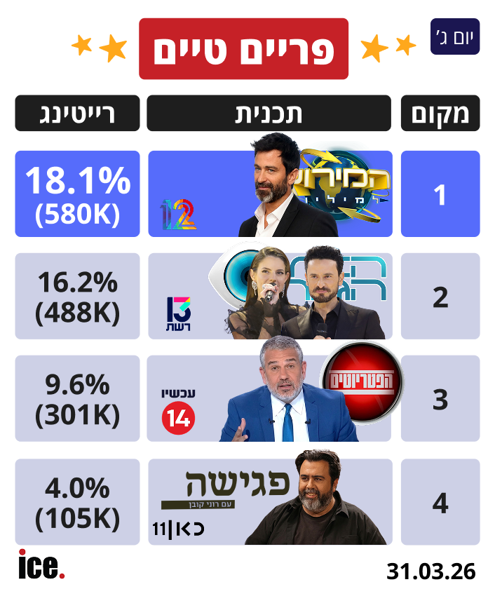 בפריים טיים, "המירוץ למיליון" וקשת 12 ממשיכים לנצח את "האח הגדול" ורשת 13 וזוכים ל-18.1% רייטינג (579 אלף צופים). "הפטריוטים" של ערוץ 14 במקום השלישי עם 9.6% רייטינג (300 אלף צופים). בתוך כך, ערוץ 14 סוגר חודש שיא ברייטינג פריים (ימי חול) 9.1%, כשהשיא הקודם עמד על 9.0% (אוקטובר 2024). "פגישה" עם רוני קובן ב"כאן 11" עם 4% רייטינג (104 אלף צופים).