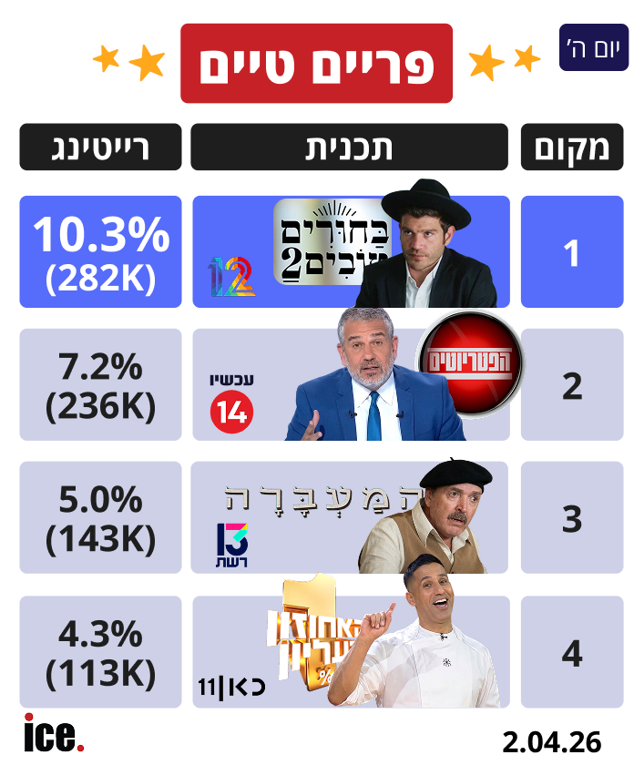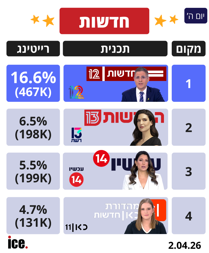 אתמול (חמישי), יום חג הפסח, מהדורת החדשות הנצפית ביותר בישראל הייתה "חדשות 12" בהנחיית עמליה דואק שזכתה ל-16.6% רייטינג (467 אלף צופים). "חדשות 13" עם דוריה למפל גרפה 6.5% רייטינג (198 אלף צופים). "מהדורת צאת החג" בערוץ 14 סוגרת את השלישייה הראשונה עם המגישה ליטל שמש וזוכה ל-5.5% רייטינג (199 אלף צופים).
