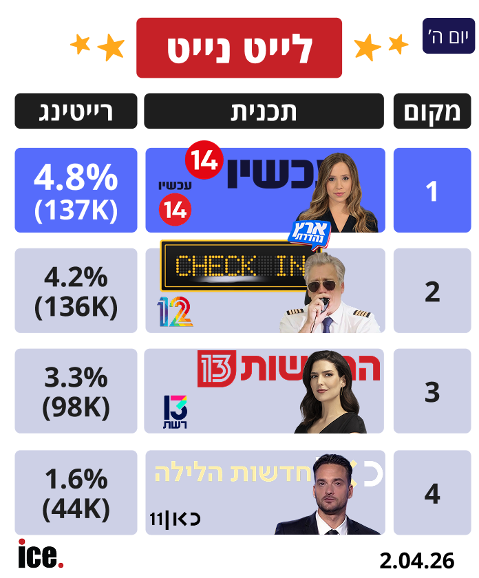 בלייט נייט, ערוץ 14 מנצח לראשונה את "קשת 12" והמשך החדשות זוכה ל-4.8% רייטינג. קשת 12 כאמור עם לקט מערכוני "צ'ק אין" של תכנית הסאטירה "ארץ נהדרת" גורפת 4.2% רייטינג (136 אלף צופים). את השלישייה הראשונה סוגרת "רשת 13" עם החדשות שגורפת 3.3% רייטינג (98 אלף צופים).