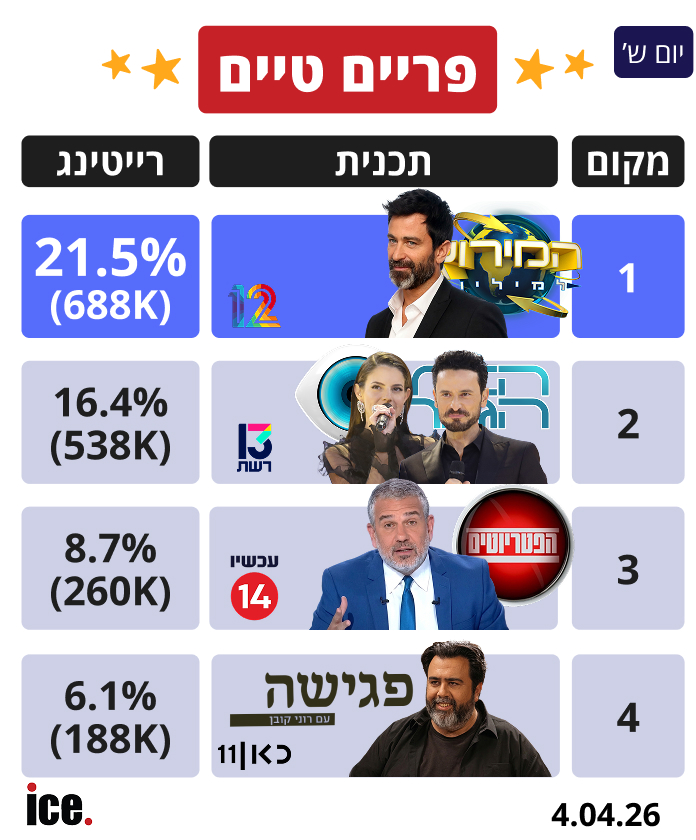 בפריים טיים, "המירוץ למיליון" בקשת 12 רושמת שיא עונתי מאז ההשקה ומסיימת כמנצחת הגדולה של הערב עם 21.5% רייטינג (688 אלף צופים). משדר ההדחה השלישי של "האח הגדול" ברשת 13 זוכה ל-16.4% רייטינג (538 אלף צופים). "הפטריוטים" של ערוץ 14 נועצת את השלישייה הראשונה עם 8.7% רייטינג (260 אלף צופים).