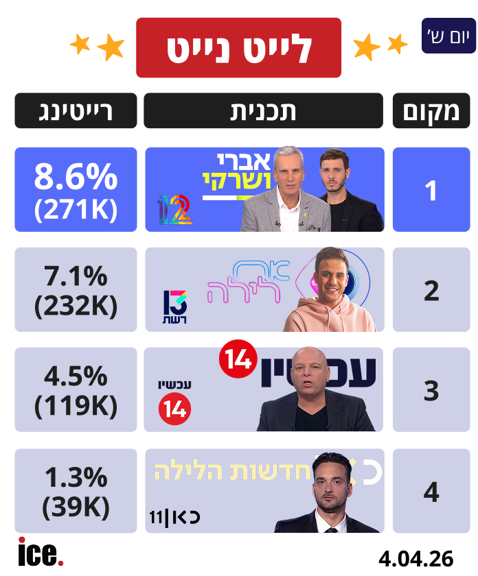 בלייט נייט, "אברי ושרקי" מככבים על המסך של קשת עם 8.6% רייטינג (271 אלף צופים). "אח לילה" ברשת 13 בהנחיית קווין רובין גורפת 7.1% רייטינג (232 אלף צופים). המקום השלישי שייך להמשך החדשות של ערוץ 14 עם 4.5% רייטינג (119 אלף צופים).