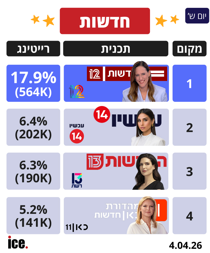 אתמול (שבת) מהדורת החדשות הנצפית ביותר בישראל הייתה "חדשות 12" שגרפה 17.9% רייטינג (564 אלף צופים). במקום השני, "חדשות 14" עם 6.4% רייטינג (202 אלף צופים). היא עקפה בפער קטן את "חדשות 13" שהשיגה 6.3% רייטינג (190 אלף צופים).