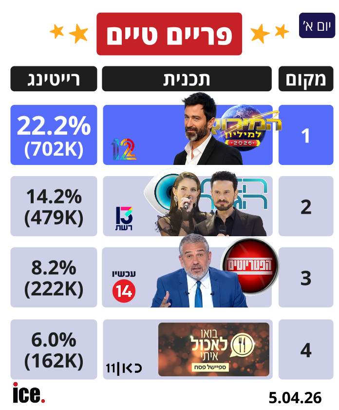 דירוג הרייטינג היומי של ice: פצצת הרייטינג של קשת 12, "המירוץ למיליון" רשמה שיא אדיר של 22.2% ו-703 אלף צופים, "האח הגדול" ממשיכה בירידה עם 14.2% רייטינג ו-479 אלף צופים, וכמה עשו "הפטריוטים"?