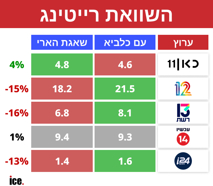 מהדורת החדשות של חברת החדשות בקשת 12 ירדה ב-15% (מ-21.5% ל-18.2%), אם כי שמרה על ממוצע גבוה ברייטינג. רשת 13 נחלשת ב-16% (מ-8.1% ל-6.8%). i24NEWS מאבדת 13% (מ-1.6% ל-1.4%) וערוץ 14 נותר ללא שינוי מהותי - כל הנ"ל בהשוואה למבצע "עם כלביא, כאמור.