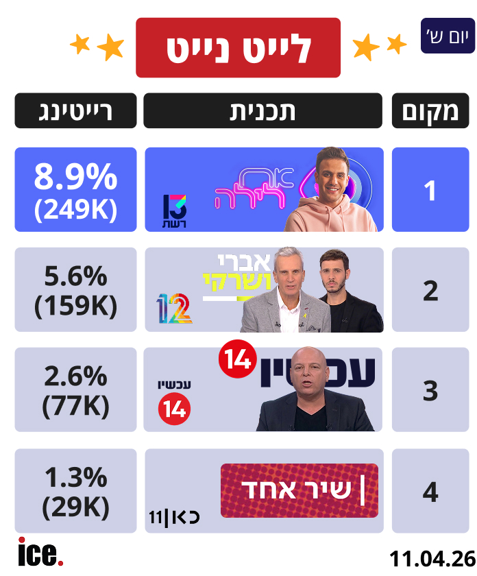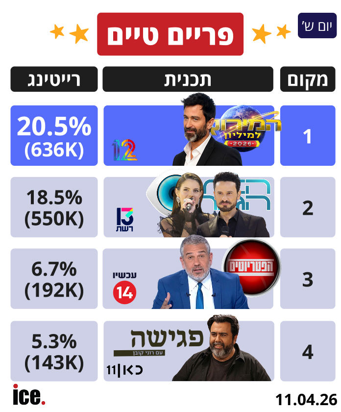 1.ומה לגבי נתוני הרייטינג של יום שישי? (ל"ת)אזרח הגון 04/2026/12הגב לתגובה זו1 0סגור