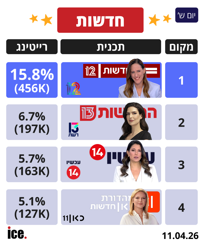 במסגרת רצועת החדשות: במקום הראשון חדשות 12 15.8% רייטינג שהם כ-456 אלף צופים. במקום השני חדשות 13 עם 6.7% רייטינג שהם כ-197 אלף צופים. במקום השלישי ערוץ 14 עם 5.7% רייטינג שהם כ-163 אלף צופים. במקום הרביעי "כאן חדשות" עם 5.1% רייטינג שהם כ-127 אלף צופים.