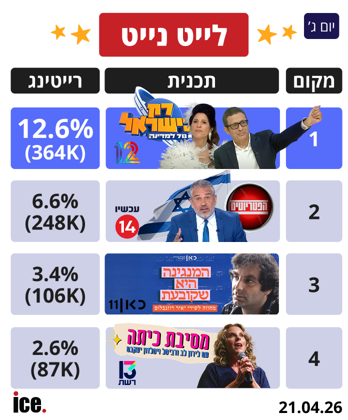 1.15 אחוז אולי מובילים אבל בטח שאינם מדורת השבטחכו ותראו 04/2026/22הגב לתגובה זו3 0וגם זה זמני עד לפרסום נתוני האמת של הרייטינג.סגור