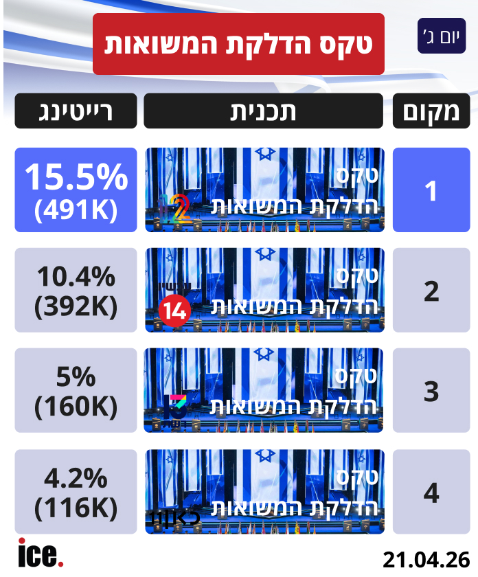אירועי יום העצמאות של מדינת ישראל סיפקו לנו לא רק טקס הדלקת משואות מרגש, אלא גם קרב רייטינג מסקרן. במבחן התוצאה של השידור המרכזי והיוקרתי ביותר של הערב, טקס הדלקת המשואות, קשת 12 ממשיכה להוכיח שהיא המדורה המרכזית של השבט כשהיא קוטפת בקלות את המקום הראשון עם 15.5 אחוזי צפייה, המיתרגמים ל-491 אלף צופים.