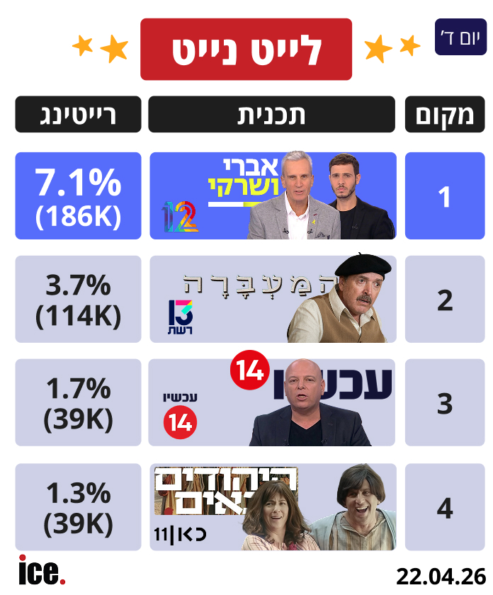 ברצועת הפריים השני, "אברי ושרקי" (קשת 12) מובילים את הלילה עם 7.1% ו-186 אלף צופים. במרחק ניכר מהם נמצאים יתר הערוצים בקרב צמוד: "פתחי את שי" (ערוץ 14) עם 3.9% ו-110 אלף צופים, "מה שתגידו" (כאן 11) עם 3.8% ו-100 אלף צופים, וסדרת הדוקו "המעברה" (רשת 13) שסוגרת את הרצועה עם 3.7% ו-114 אלף צופים.