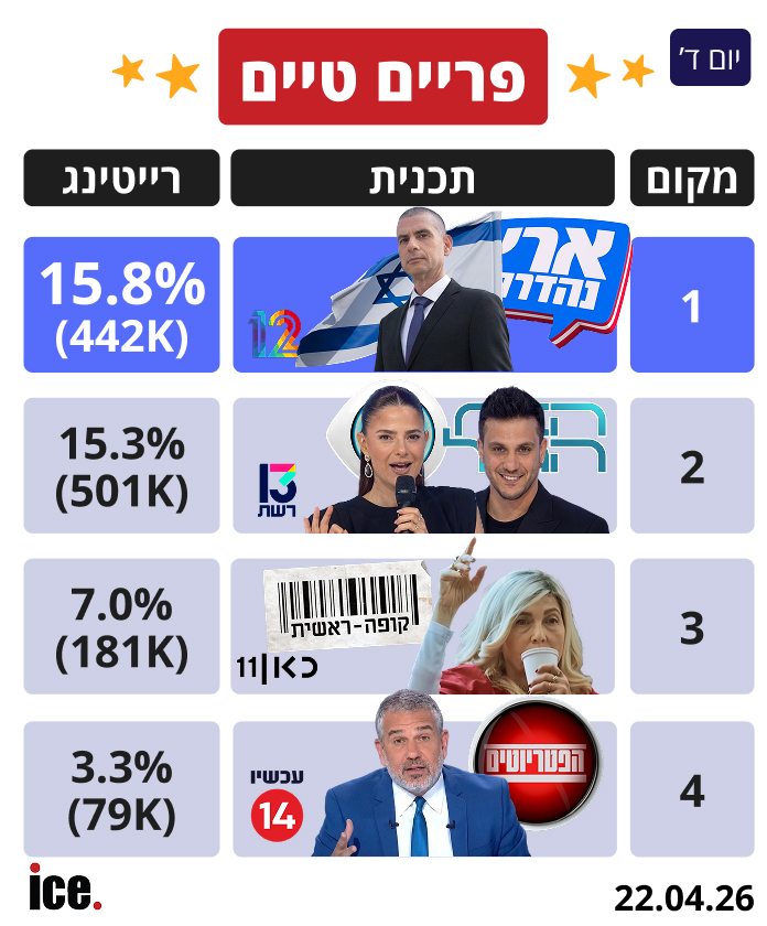 ברצועת הפריים טיים נרשם קרב ענקים בין תוכניות הדגל של הערוצים המסחריים. ספיישל העצמאות של "ארץ נהדרת" (קשת 12) הניב את אחוז הרייטינג הגבוה ביותר עם 15.8% (441 אלף צופים), בעוד "האח הגדול" (רשת 13) הציגה כמות צופים כוללת גבוהה יותר שהגיעה ל-500 אלף איש אך רשמה כמות פחותה יותר של אחוזים (15.3%). במקביל, ספיישל העצמאות של "קופה ראשית" בכאן 11 רשם הישג נאה של 7.4% ו-192 אלף צופים, וגבר במעט על "הפטריוטים" בערוץ 14 שהשיגו 7.0% ו-216 אלף צופים.