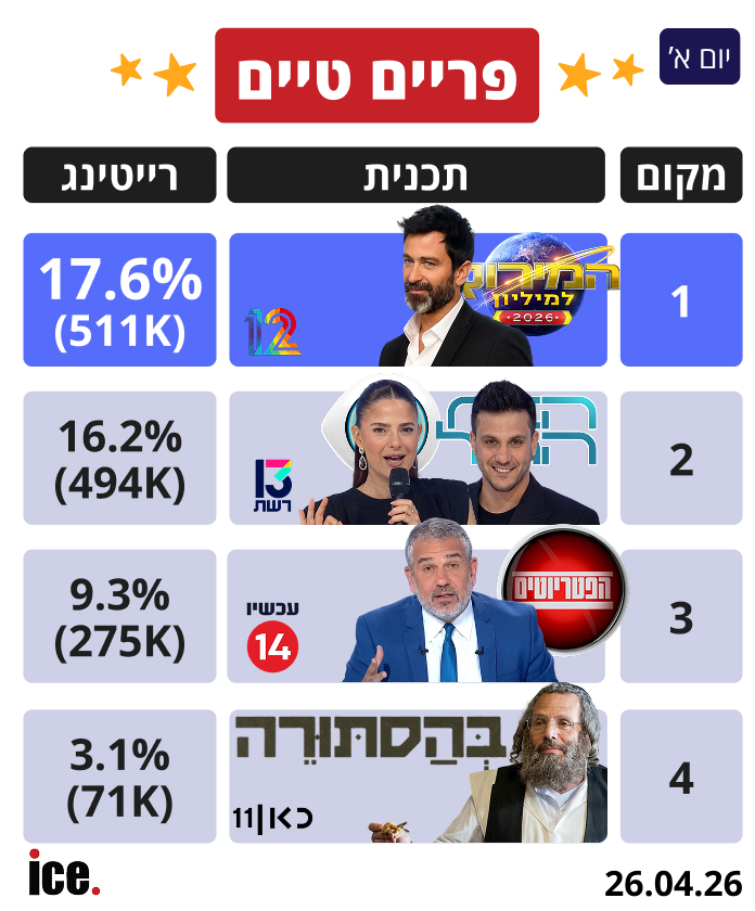 1.רביד דרוקר מביא רייטינג 5% ומרוויח מליונים, שלזינגרשמשון ויובב 04/2026/27הגב לתגובה זו1 0מקבל 100 שקל ומנה פלאפל ומביא אותו רייטינג עם ברדוגו השמןסגור