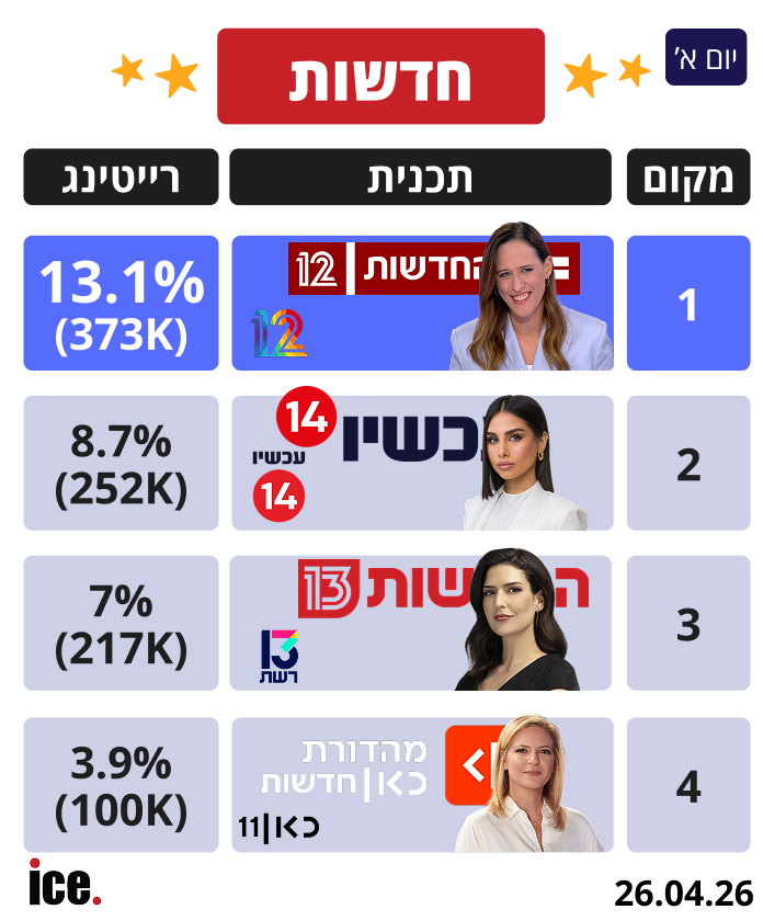 בגזרת מהדורת החדשות, קשת 12 ממשיכה לככב. המהדורה המרכזית של ערוץ 12 רשמה 13.1% רייטינג ו-373 אלף צופים, מייד אחריה מהדורת חדשות 14 שהפתיעה את ערוץ 13 לאחר שהשיגה נתון של 8.7% רייטינג ו-252 אלף צופים. המהדורה המרכזית של ערוץ 13 נמצאת במקום השלישי עם 7.0% רייטינג ו-217 אלף צופים, ומהדורת כאן 11 סוגרת עם 3.9% רייטינג ו-100 אלף צופים.