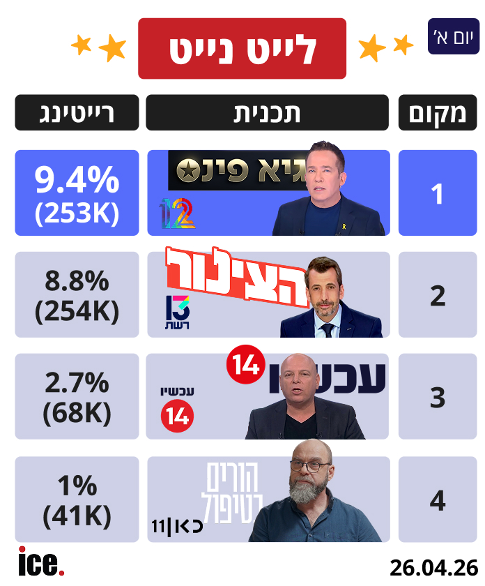 בגזרת הלייט נייט, התכנית של גיא פינס בקשת 12 בפסגה עם 9.4% רייטינג ו-253 אלף צופים. "הצינור" ברשת 13 עם 8.8% רייטינג ו-254 אלף צופים. "אמברגו" בערוץ 14 עם 5.6% רייטינג ו-157 אלף צופים. "חדשות הלילה" של כאן 11 רשמה 1.8% רייטינג ו-56 אלף צופים, מה שמותיר אותה במקום הרביעי והאחרון.