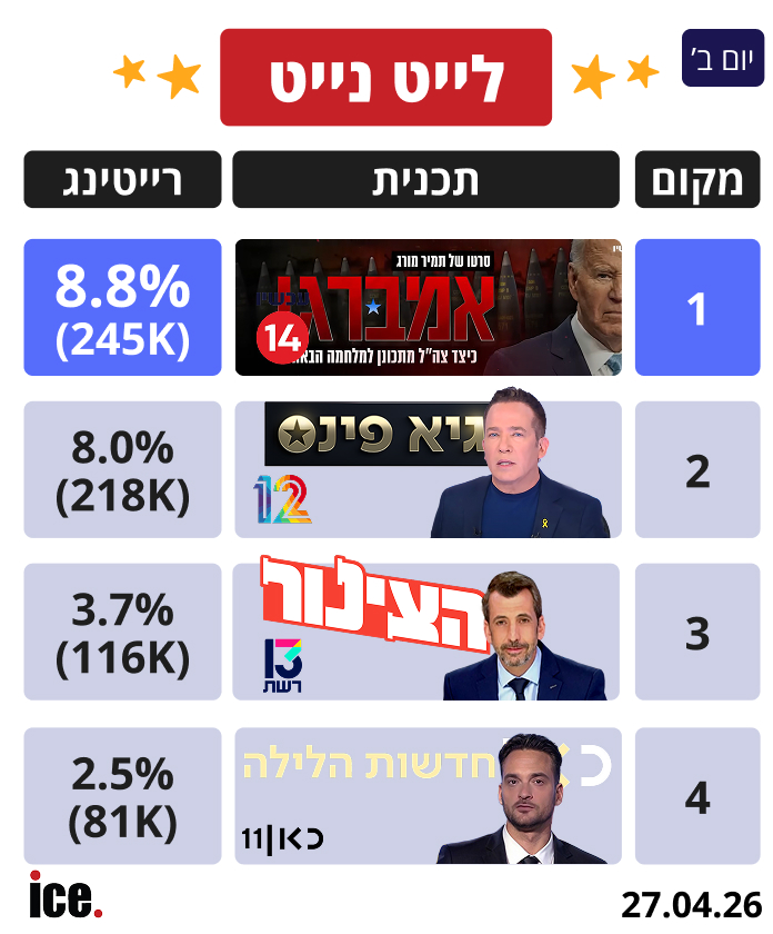 אמש רשמו הערוצים מהפך דרמטי שערוץ 14 טיפס למעלה בכל הגזרות ואף הוביל בגזרת הלייט נייט. את הפריים טיים והמהדורה המרכזית ערוץ 12 הוביל אך ערוץ 14 ניצב מיד לאחריהם