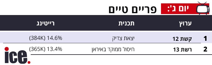 אמש (שלישי) בפריים טיים, קשת 12 שוב ניצחה די בקושי את רשת 13, כאשר יצאת צדיק עם חיים אתגר הביאה 14.6% ו-384 אלף צופים בסך הכל, בעוד התחקיר של אלון בן דוד 'חיסול ממוקד באיראן' הביא 13.4% ו-365 אלף צופים.