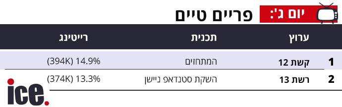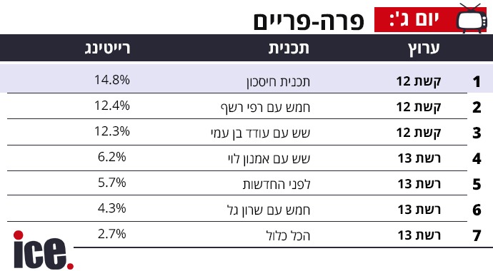 בפרה פריים, קשת 12 עם עוד ערב של ניצחונות כאשר תכנית חיסכון ניפקה נתונים נהדרים של 14.8%, חמש עם רפי רשף - 12.4%, שש עם עודד בן עמי הביאה 12.3%. ברשת 13, שש עם אמנון לוי השיגה 6.2%, לפני החדשות עם 5.7%, חמש עם שרון גל עם 4.3% והכל כלול עם 2.7% בלבד.
