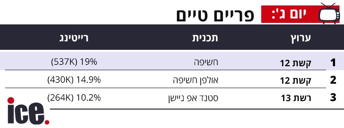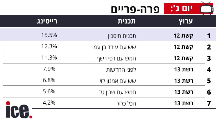 בפרה פריים, קשת 12 חגגה כהרגלה עם נתונים נהדרים, כאשר תכנית חיסכון בראש עם 15.5%, שש עם עודד בן עמי 12.3% וחמש עם רפי רשף - 11.3%. לפני החדשות של רשת 13 הביאה 7.9%, שש עם אמנון לוי הסתפקה ב-6.8%, חמש עם שרון גל - 5.6% והכל כלול עם 4.2%.