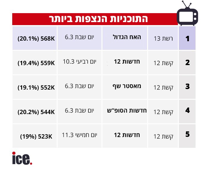 הפתעה! אפילו אנחנו לא זוכרים מתי לאחרונה רשת 13 הובילה את טבלת הרייטינג השבועי, אבל זה קרה בשבוע החולף כאשר האח הגדול סיפקה פרק לפנתיאון שהביא רייטינג שיא של 20.1% ו-562 אלף צופים, בדרך לכיבוש הפסגה על חשבון קשת 12 שמשלימה את שאר הטבלה.