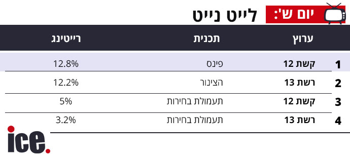 בלייט נייט לוקח גיא פינס את הצינור בפער קטן של 0.6%. שידורי תעמולת הבחירות בשני הערוצים עם אחוזים נמוכים יחסית כצפוי, אך בהובלה של קשת 12 על רשת 13, כשלראשונה 5% ולאחרונה 3.2%.