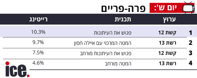 בזירת הפרה-פריים מדדים צמודים בין פגוש את העיתונות של 12 עם 10.3% לעומת 9.7% לעומת המרכזי עם איילה חסון שהגיע לשיא רייטינג של 11.1% בזמן הריאיון של בנימין נתניהו בתוכנית. בפגוש את העיתונות מורחב מול המטה המורחב פער גדול של 3.1% לטובת פגוש את העיתונות מורחב של קשת 12.