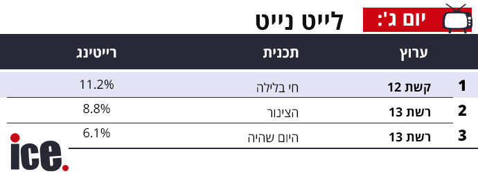 בלייט נייט, קשת 12 גרפה ניצחון נוסף עם חי בלילה שהשיגה 11.2% לעומת רשת 13 שם הצינור הסתפקה ב-8.8% בלבד והיום שהיה השיגה 6.1% בלבד.
