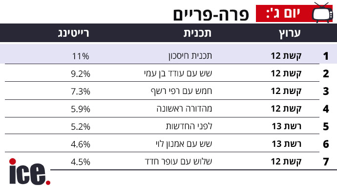 בפרה פריים, התכניות של קשת 12 לא התקשו להשתלט על הצמרת כאשר תכנית חיסכון הניבה 11%, שש עם עודד בן עמי נהנתה מ-9.2%, חמש עם רפי רשף השיגה 7.3% ומהדורה ראשונה עם 5.9%, שש עם אמנון לוי השיגה 4.6% בלבד. עופר חדד גם נכנס לרשימה עבור קשת 12 עם 4.5%.