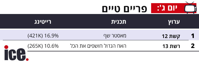 תכנית הבישול עם פרק שהניב 16.9% ו-421 אלף צופים, האם זה הספיק מול האח הגדול 'חושפים הכל'? בכל מקרה בשאר הרצועות הפערים בין קשת 12 לרשת 13 גדולים מאוד. הנתונים בפנים