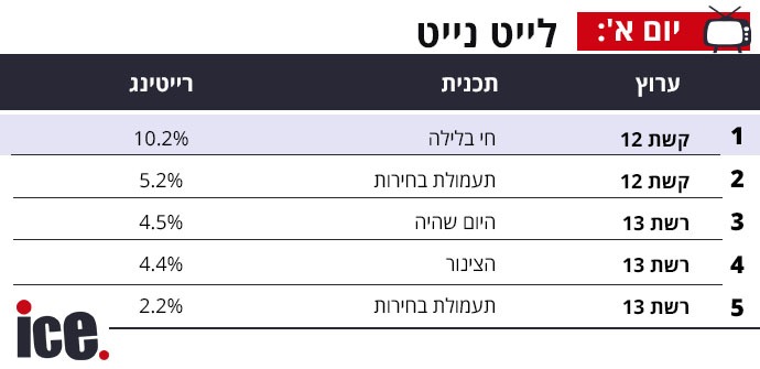 בלייט נייט, קשת 12 שוב ניצחה בפער גדול כאשר חי בלילה הניבה 10.2% ותעמולת הבחירות עם 5.2%, הרבה יותר מהיום שהיה שהסתפקה ב-4.5% והצינור של גיא לרר שרשמה רק 4.4%