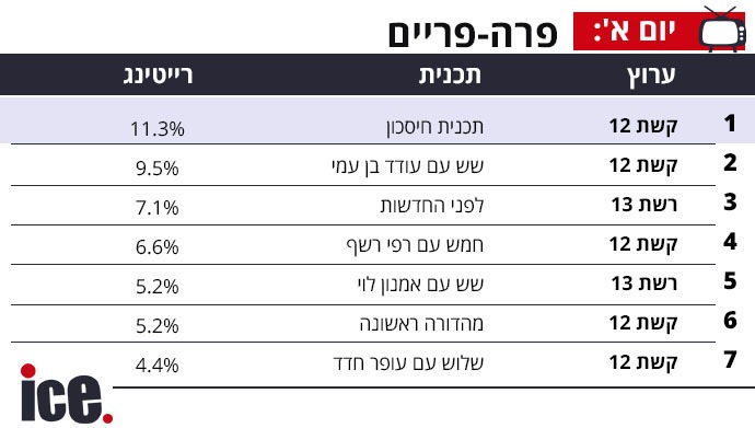 בפרה פריים, קשת 12 עם 11.3% לתכנית חיסכון, שש עם עודד בן עמי קיבלה 9.5%, בעוד שלפני החדשות של רשת 13 סיפקה 7.1%, מעל חמש עם רפי רשף לו היו 6.6%. שש עם אמנון לוי ברשת עם 5.2% בלבד, כאשר מהדורה ראשונה בקשת עם 5.2% גם כן ושלוש עם עופר חדד סיפקה 4.4%.