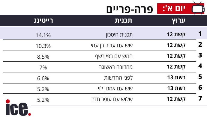 בפרה פריים, קשת 12 שלטה עם תכנית חיסכון שהניבה 14.1%, שש עם עודד בן עמי שניפקה 10.3% וחמש עם רפי רשף שהשיגה 8.5%, בעוד שמהדורה ראשונה הביאה 7%. רשת 13 עם נציגות של לפני החדשות שרשמה 6.6% ושש עם אמנון לוי שהסתפקה ב-5.2% בלבד. שלוש עם עופר חדד בקשת 12 השיגה נתון זהה.