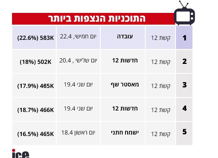 על אף נתונים לא רעים, ריאליטי הבישול האהוב של רשת 13 לא הצליח להתקרב לנתונים שהביאו חמש התכניות הנצפות ביותר של השבוע, כולן של קשת 12. כמה מהדורות חדשות נכנסו לשם? וכמה פרקים של מאסטר שף?