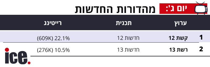 במהדורות החדשות המרכזיות ניצחון ענק לחדשות 12 עם 22.1% רייטינג וכ-609 אלף. חדשות 13 עם 10.5% וכ-276 אלף צופים.